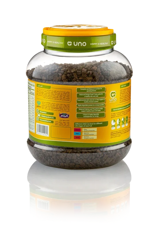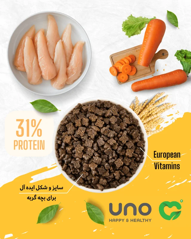 غذای سوپر پریمیوم گربه کیتن اونو UNO یک غذای بسیار خوش خوراک با 31% پروتئین خالص آزمایش شده است. کلیه محصولات اونو حاوی سری کامل ویتامین ها و مواد معدنی تامین شده از BASF آلمان، DSM هلند و Adisseo فرانسه میباشند. این غذا کلیه ویتامین ها و مواد معدنی مورد نیاز گربه شما را تامین میکند و نیازی به مکمل اضافی ندارید.